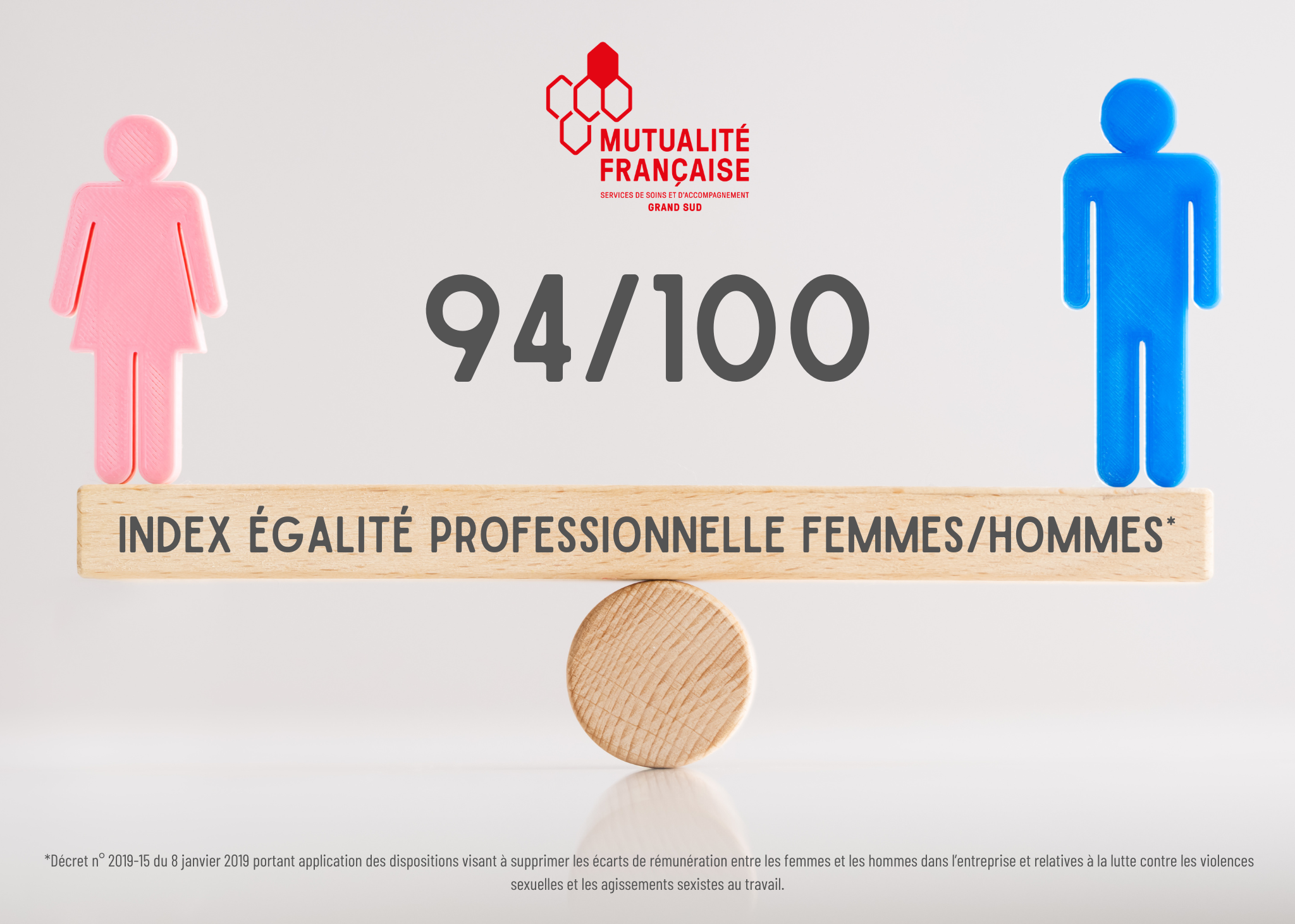 Nous sommes fiers d'annoncer que Mutualité Française Grand Sud a obtenu pour l’année 2025 une note de 94/100 sur son index égalité femmes/hommes, traduisant la place essentielle accordée à la parité au sein de notre entreprise. Ce résultat témoigne de notre engagement continu pour assurer l’équité entre les collaborateurs et l’égalité des sexes. Nous restons déterminés à créer un environnement inclusif ou chacun a la possibilité de s’épanouir, indépendamment de son genre.